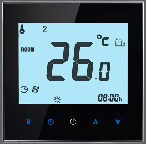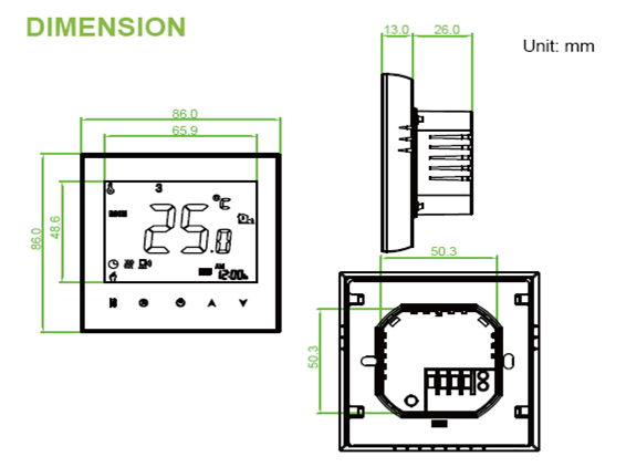 The DHTP05 is a modern, stylish, touch screen, Smart Grid (SG) enabled programmable digital heating-cooling controller. Control of the thermostat is via a sleek touch screen interface. The controller can be used for heating or cooling with an internal or external signal used to switch the controller between heating and cooling mode. This is particularly useful for heating & cooling applications where a centrally controlled system (Heat Pump) switches seasonally between heating & cooling. The environment with in a room / zone can be controlled precisely to ensure that the required comfort levels are achieved efficiently. The microprocessor (brain) of the controller lets the user configure time, temperature control options to suit daily, weekly or weekend schedules. In addition to this and as already outlined the controller provides the possibility to seasonally switch between (Heating and Cooling). Smart Grid (SG) functionality permits the user to increase or decrease temperature setpoints to avail of low cost electrical energy provided by the Electrical power supply company or when renewable energy is generated onsite. Its modern slimline design and easyflow’ menu structure makes it the perfect choice for the consumer. The DHTP05 has many configurable control options making it flexible, adaptable and Smart.